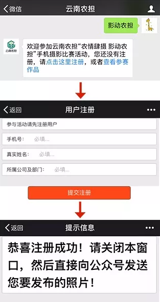 參與方式一:關(guān)注【云南農(nóng)擔(dān)】官方微信號(hào)(在微信公眾號(hào)添加中搜索“云南農(nóng)擔(dān)”或“ynnd2018”即可關(guān)注),在對話框中輸入“影動(dòng)農(nóng)擔(dān)”四個(gè)字,根據(jù)提示完成信息錄入,在對話框內(nèi)發(fā)送1張圖片及一句話描述即可。