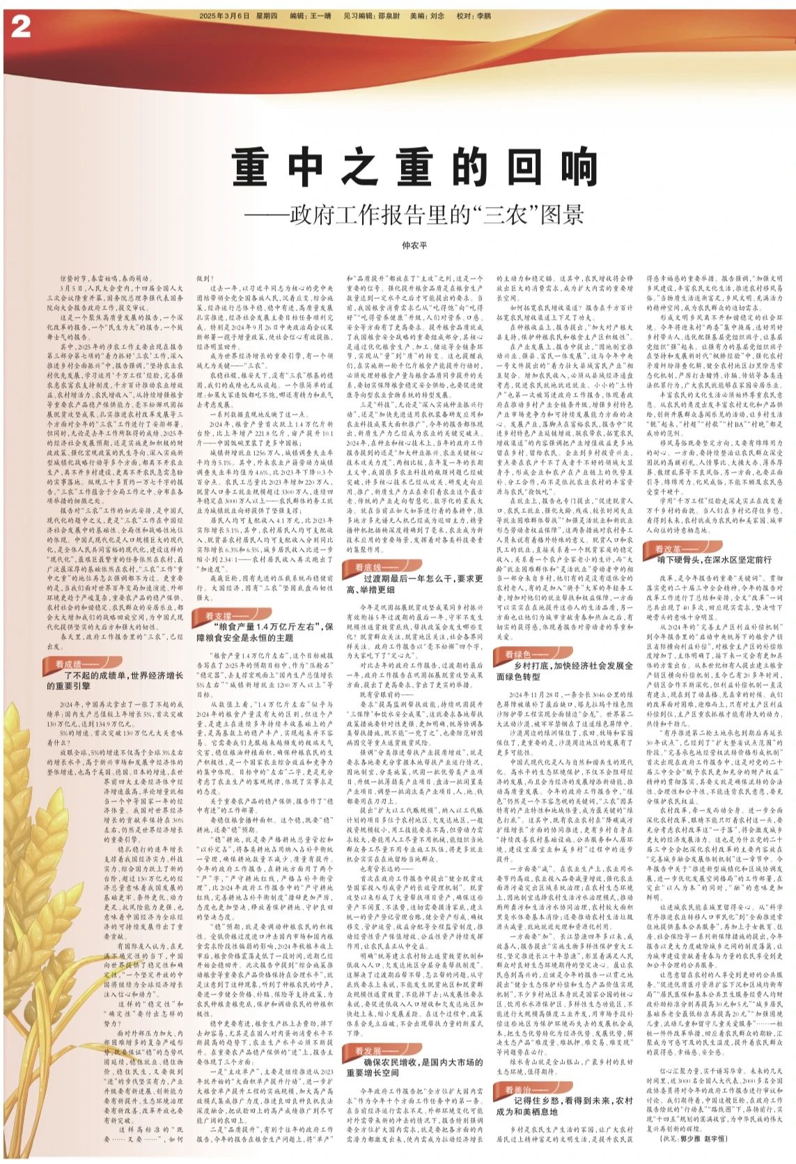 其中,2025年的涉農工作主要出現(xiàn)在報告第三部分第七項的“著力抓好‘三農’工作,深入推進鄉(xiāng)村全面振興”中,報告強調,“堅持農業(yè)農村優(yōu)先發(fā)展,學習運用‘千萬工程’經(jīng)驗,完善強農惠農富農支持制度,千方百計推動農業(yè)增效益、農村增活力、農民增收入”,從持續(xù)增強糧食等重要農產品穩(wěn)產保供能力、毫不松懈鞏固拓展脫貧攻堅成果、扎實推進農村改革發(fā)展等三個方面對全年的“三農”工作進行了安排部署。但同時,無論是去年工作所取得的成績、2025年的經(jīng)濟社會發(fā)展預期,還是實施更加積極的財政政策、強化宏觀政策的民生導向、深入實施新型城鎮(zhèn)化戰(zhàn)略行動等多個方面,都離不開農業(yè)生產,離不開鄉(xiāng)村建設,更離不開農民急需急盼的實事落地。縱觀三十多頁約一萬七千字的報告,“三農”工作蘊含于全局工作之中、分布在各項舉措的細微之處。