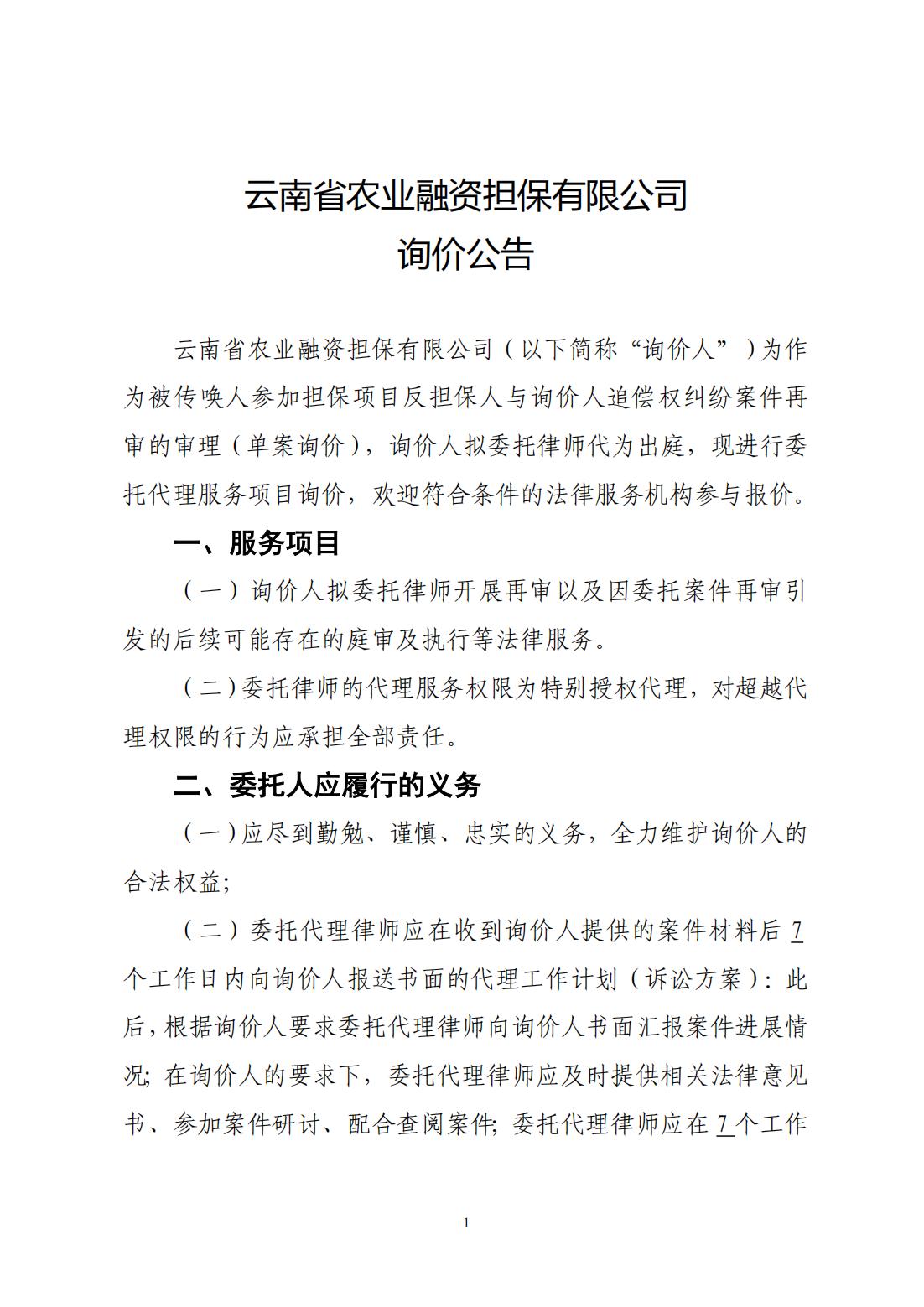 云南省農(nóng)業(yè)融資擔保有限公司詢價公告
