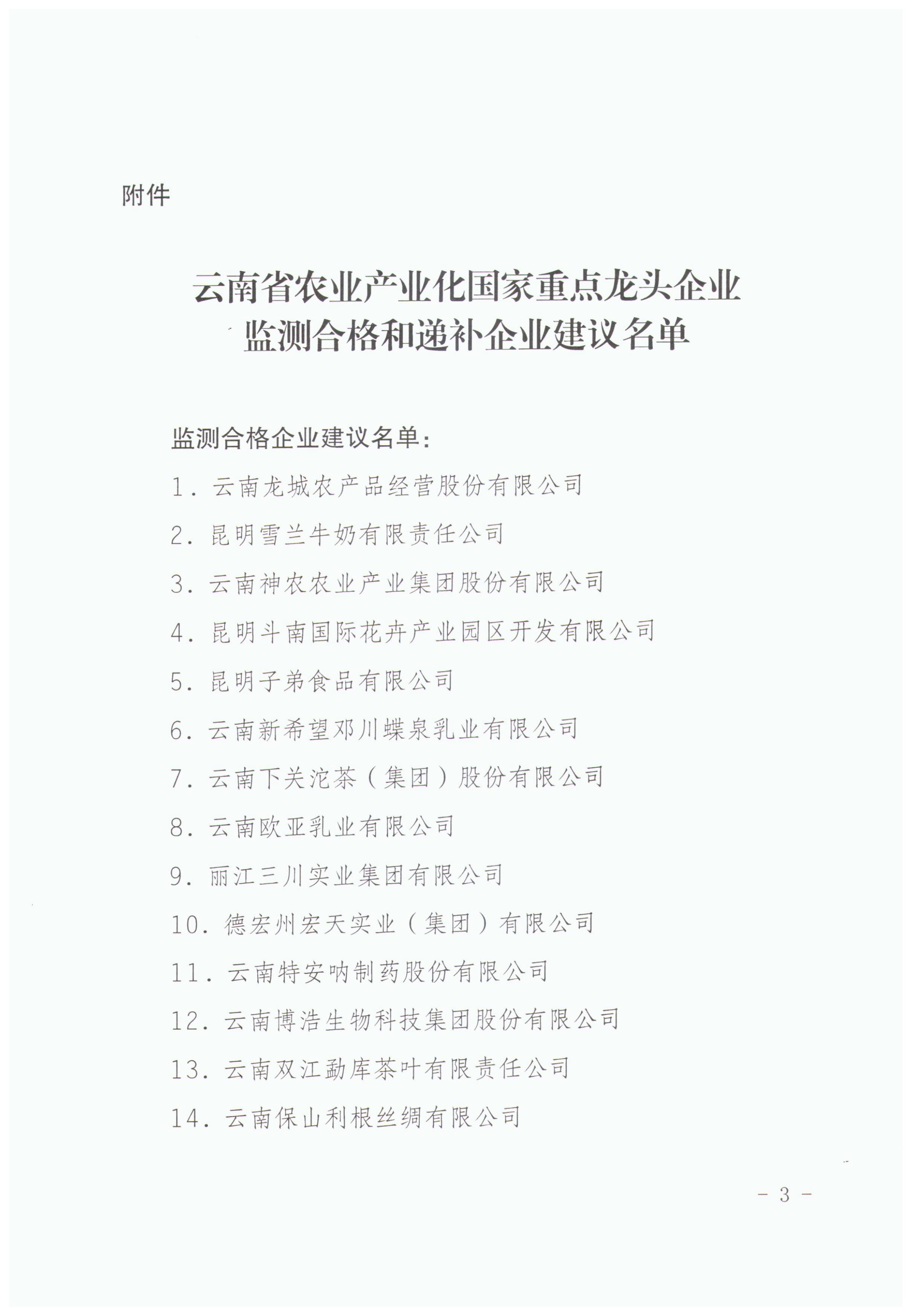 云南省農(nóng)業(yè)產(chǎn)業(yè)化國(guó)家重點(diǎn)龍頭企業(yè)運(yùn)行監(jiān)測(cè)合格和遞補(bǔ)企業(yè)建議名單的公示