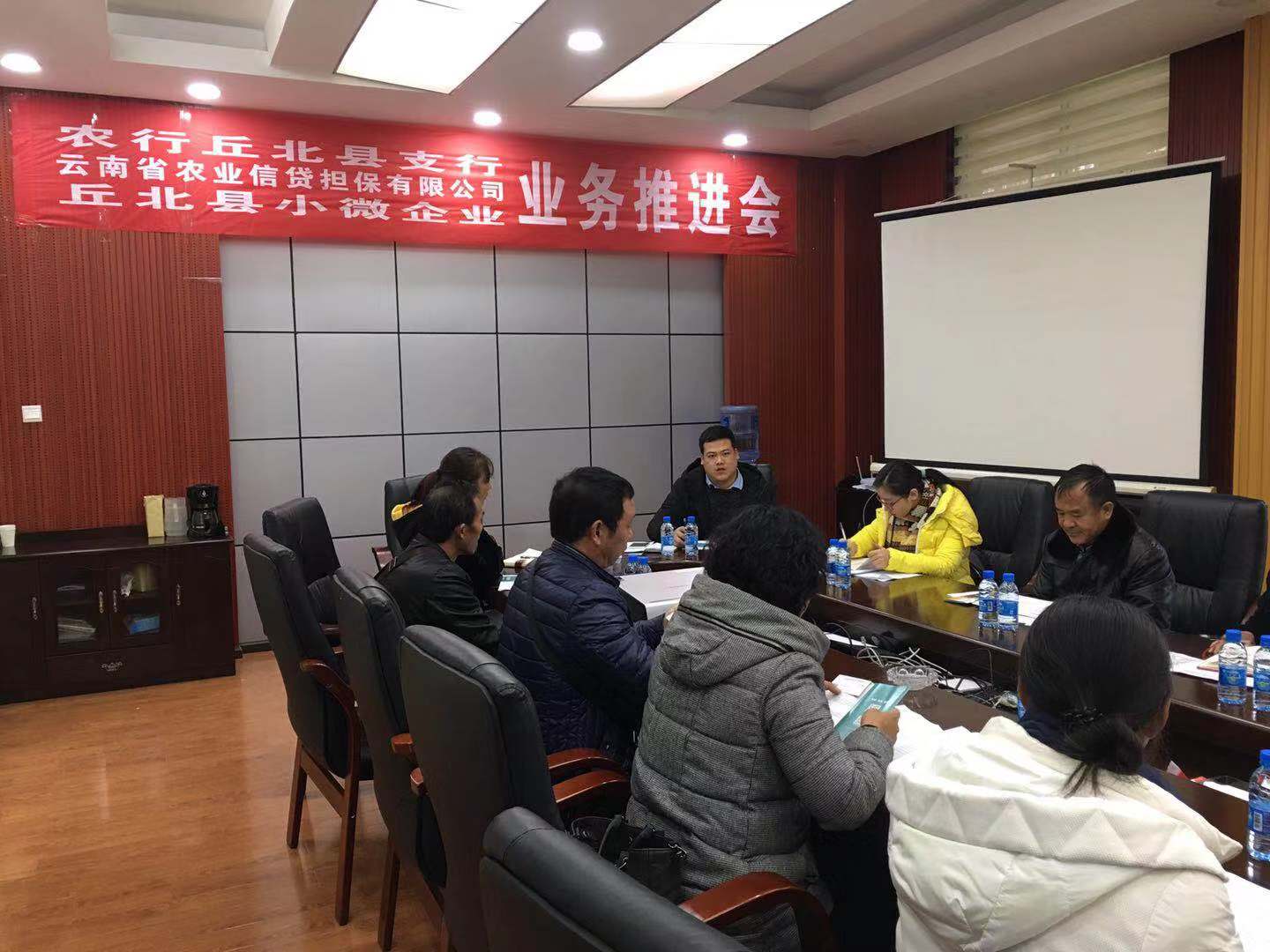 12月16日下午,農(nóng)擔(dān)公司硯山辦事處受邀到中國農(nóng)業(yè)銀行股份有限公司丘北縣支行參加丘北縣小微企業(yè)業(yè)務(wù)推進會。丘北縣工商聯(lián)主任楊沖、丘北縣農(nóng)行分管信貸業(yè)務(wù)的副行長羅紅丹、丘北縣涉農(nóng)中小企業(yè)、示范合作社代表30余人出席會議。