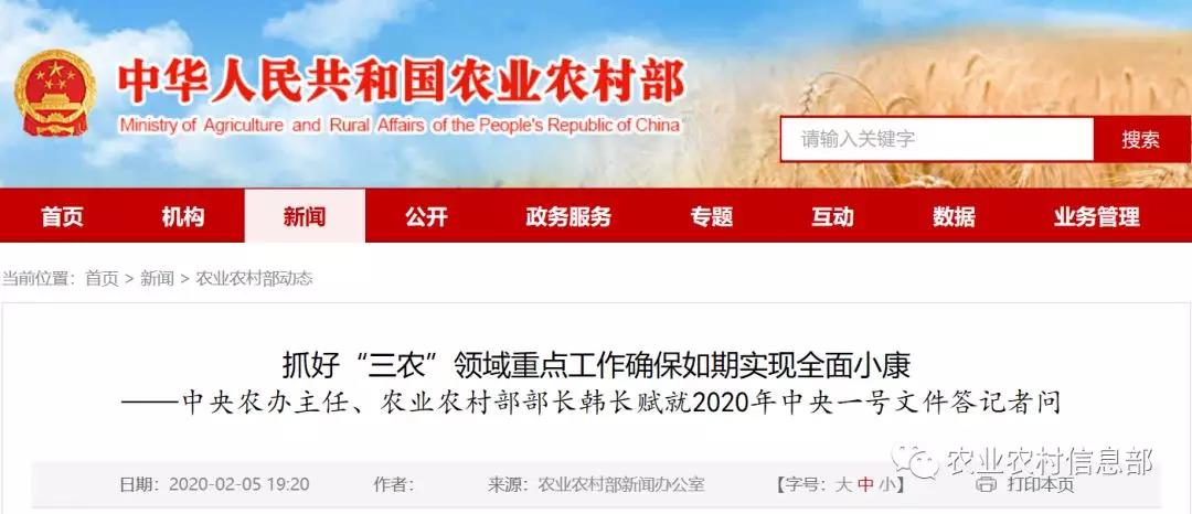 近日,中共中央、國務(wù)院印發(fā)《關(guān)于抓好“三農(nóng)”領(lǐng)域重點(diǎn)工作確保如期實現(xiàn)全面小康的意見》,也就是2020年中央一號文件。文件公開發(fā)布之際,中央農(nóng)辦主任、農(nóng)業(yè)農(nóng)村部部長韓長賦就文件制定印發(fā)和貫徹落實等問題,回答了記者的提問。