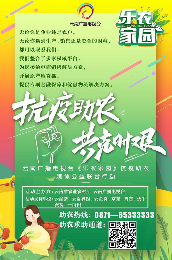 面對疫情,我們眾志成城,攜手助農(nóng)!從2020年3月1日起至6月1日,由云南省農(nóng)業(yè)農(nóng)村廳、云南廣播電視臺共同發(fā)起,針對云南省農(nóng)業(yè)生產(chǎn)地區(qū)、企業(yè)或個人遇到的生產(chǎn)、銷售、資金等問題,開展“抗疫助農(nóng),共克時艱”公益助農(nóng)活動。