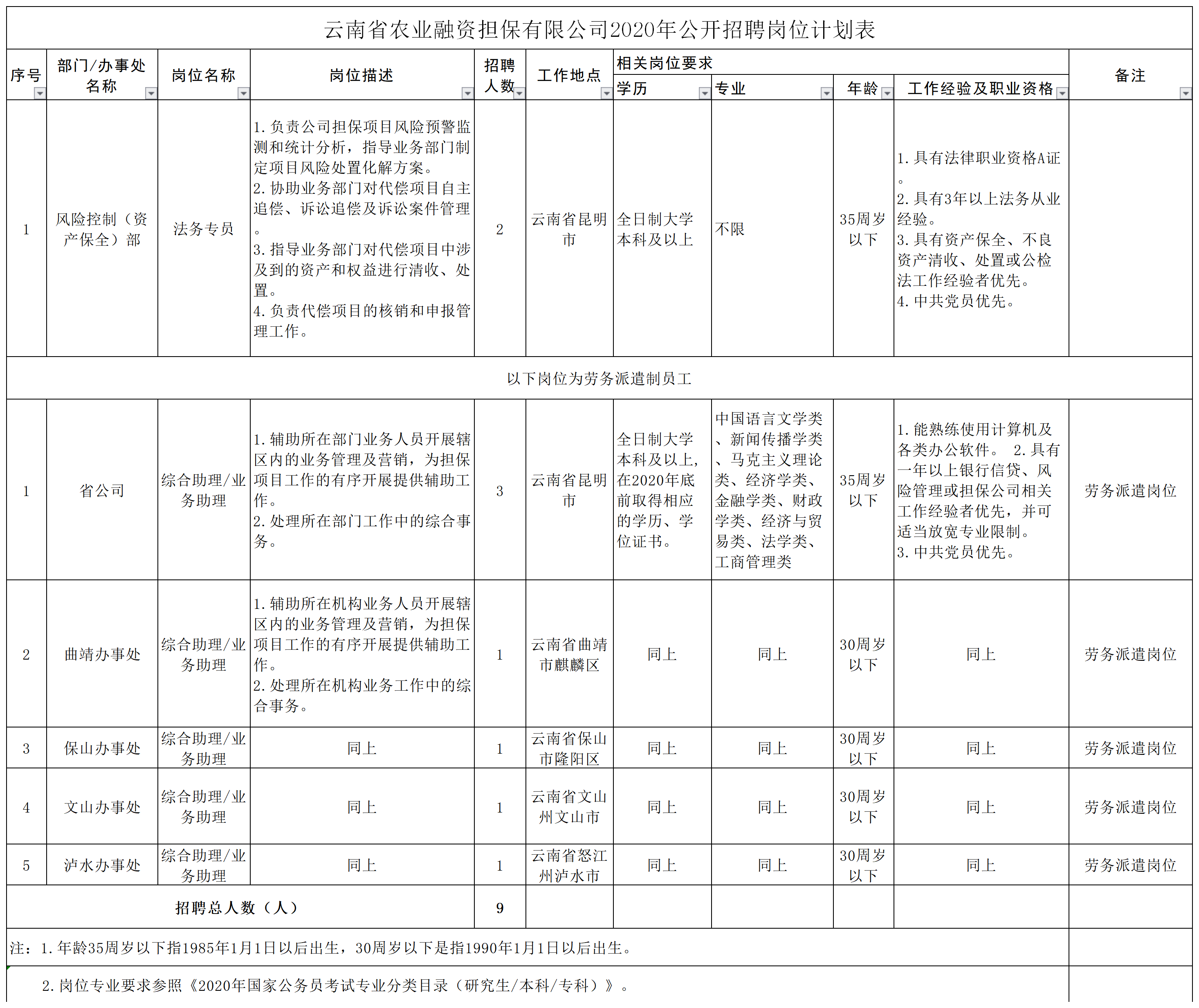 附件:云南省農業(yè)融資擔保有限公司2020年公開招聘崗位計劃表