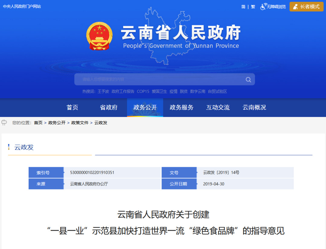 2019年云南省人民政府出臺(tái)了《云南省人民政府關(guān)于創(chuàng)建“一縣一業(yè)”示范縣 加快打造世界一流“綠色食品牌”的指導(dǎo)意見》(以下簡(jiǎn)稱《指導(dǎo)意見》)