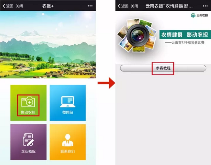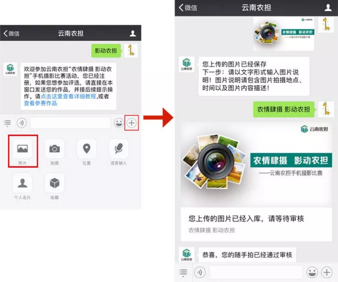 參與方式二:關(guān)注“云南農(nóng)擔(dān)”官方微信號(hào),點(diǎn)擊“農(nóng)擔(dān)+”欄目,選擇“影動(dòng)農(nóng)擔(dān)”進(jìn)入,查看教程后,完成信息錄入,在對話框內(nèi)發(fā)送1張圖片及一句話描述即可。