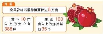 歷經(jīng)了10多年的選育、種植、示范,永勝縣的軟籽石榴產(chǎn)業(yè)已初具規(guī)模。目前,全縣軟籽石榴種植面積達5萬畝,其中種植面積在10畝以上的大戶有388戶,建成100畝以上的連片基地35個。