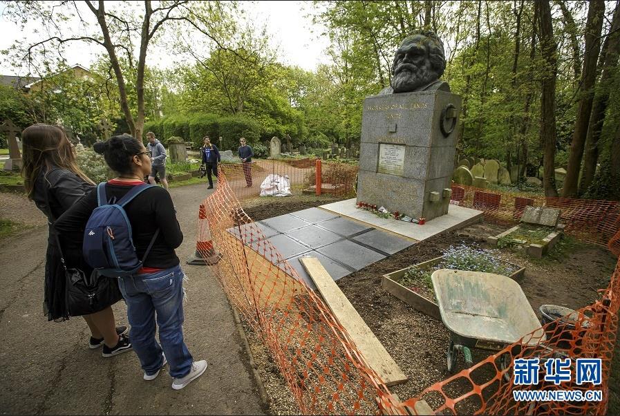 歷史長河奔流不息,真理之光穿越時空。1818年5月5日,德國小城特里爾,一代偉人馬克思誕生。200年后,世界東方。高擎馬克思主義的精神火炬,在習(xí)近平新時代中國特色社會主義思想指引下,中國共產(chǎn)黨正領(lǐng)導(dǎo)億萬人民書寫人類發(fā)展史上新的奇跡。這是2018年5月3日,在英國倫敦北部海格特公墓,人們來到正在進行維修的馬克思墓前參觀。新華社發(fā)(蒂姆·愛爾蘭攝)