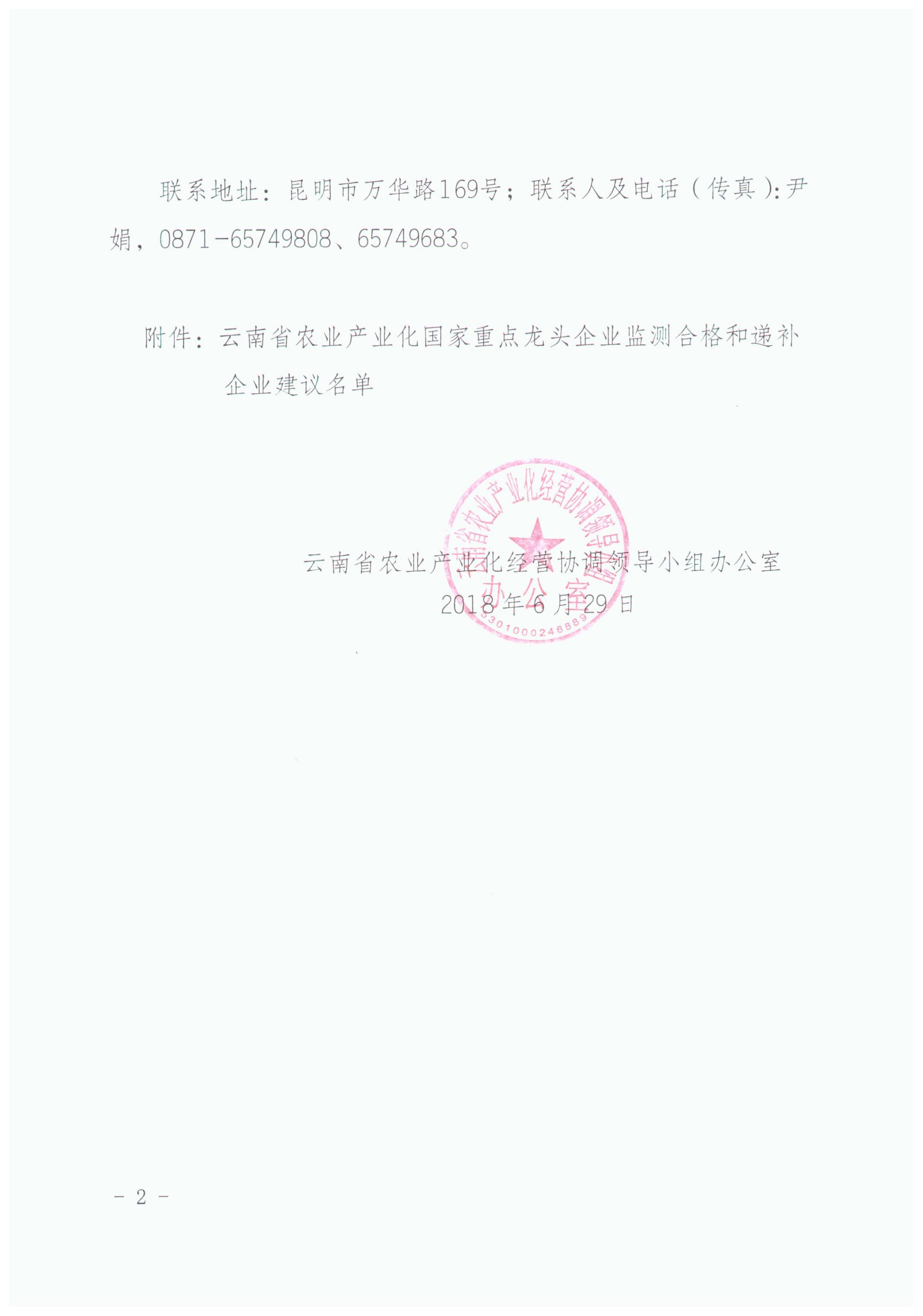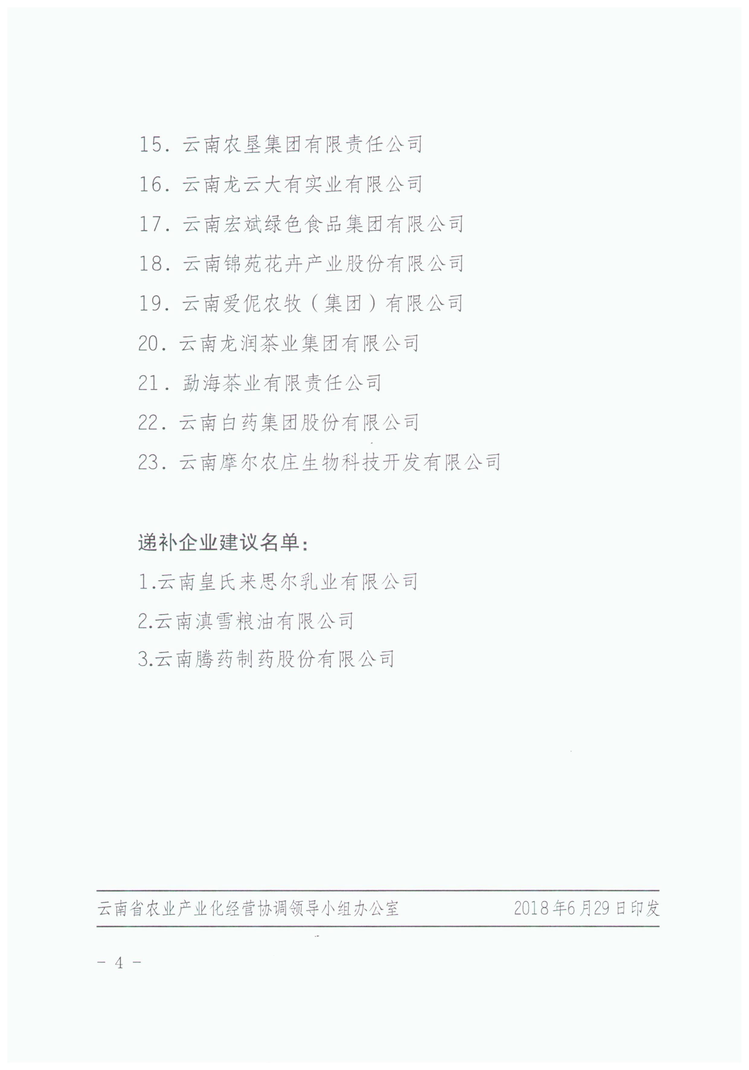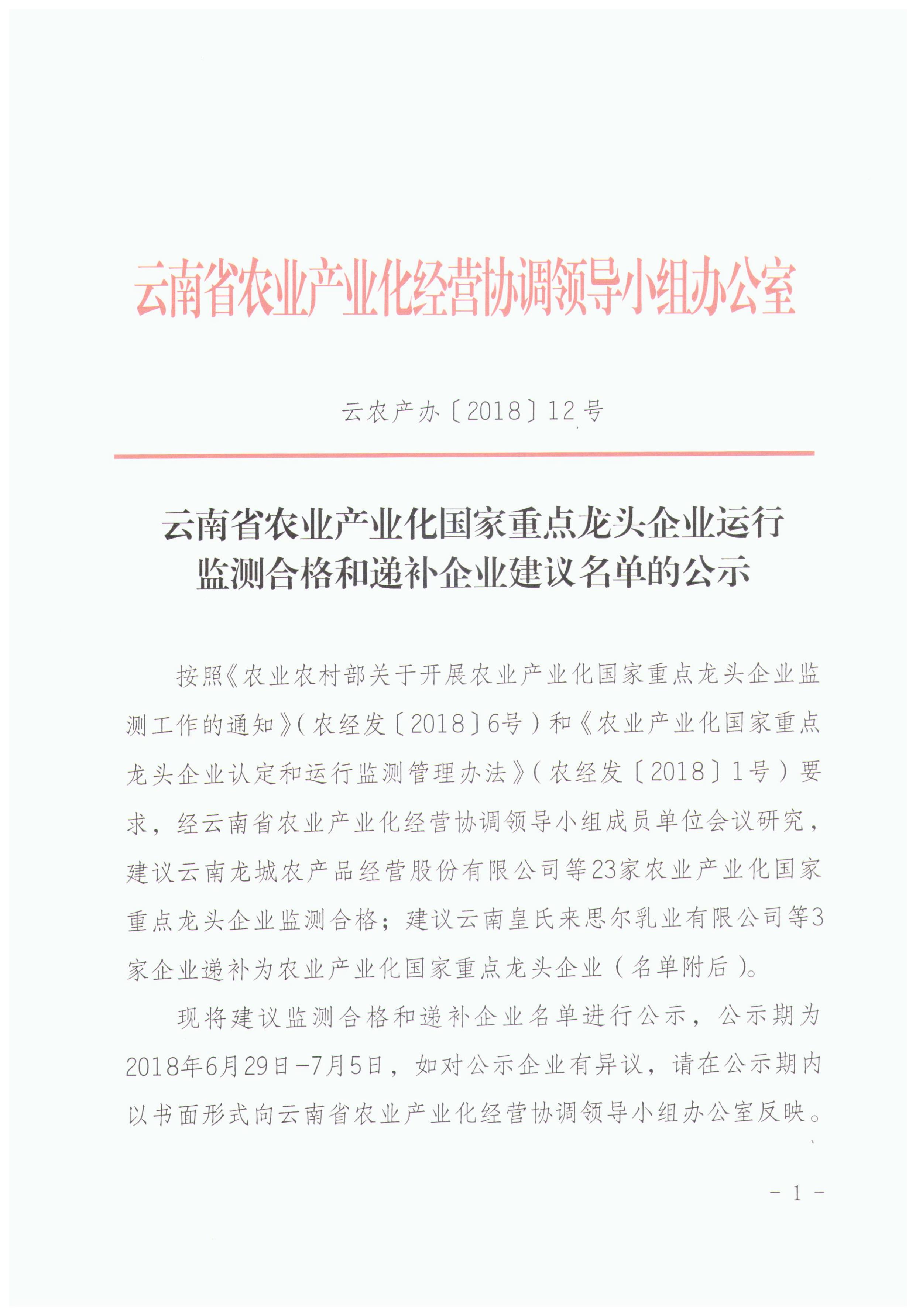 云南省農(nóng)業(yè)產(chǎn)業(yè)化國(guó)家重點(diǎn)龍頭企業(yè)運(yùn)行監(jiān)測(cè)合格和遞補(bǔ)企業(yè)建議名單的公示