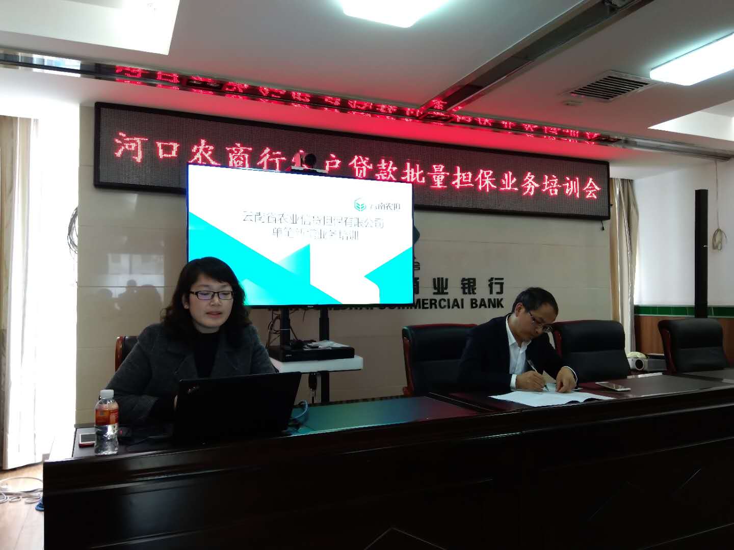 2019年1月16日下午,紅河辦事處工作人員姚燕一行受邀參加云南河口農(nóng)村商業(yè)銀行股份有限公司擔保業(yè)務(wù)培訓會,河口農(nóng)商行行長李杰、信貸部經(jīng)理胡云、各支行網(wǎng)點信貸負責人參加了此次培訓。