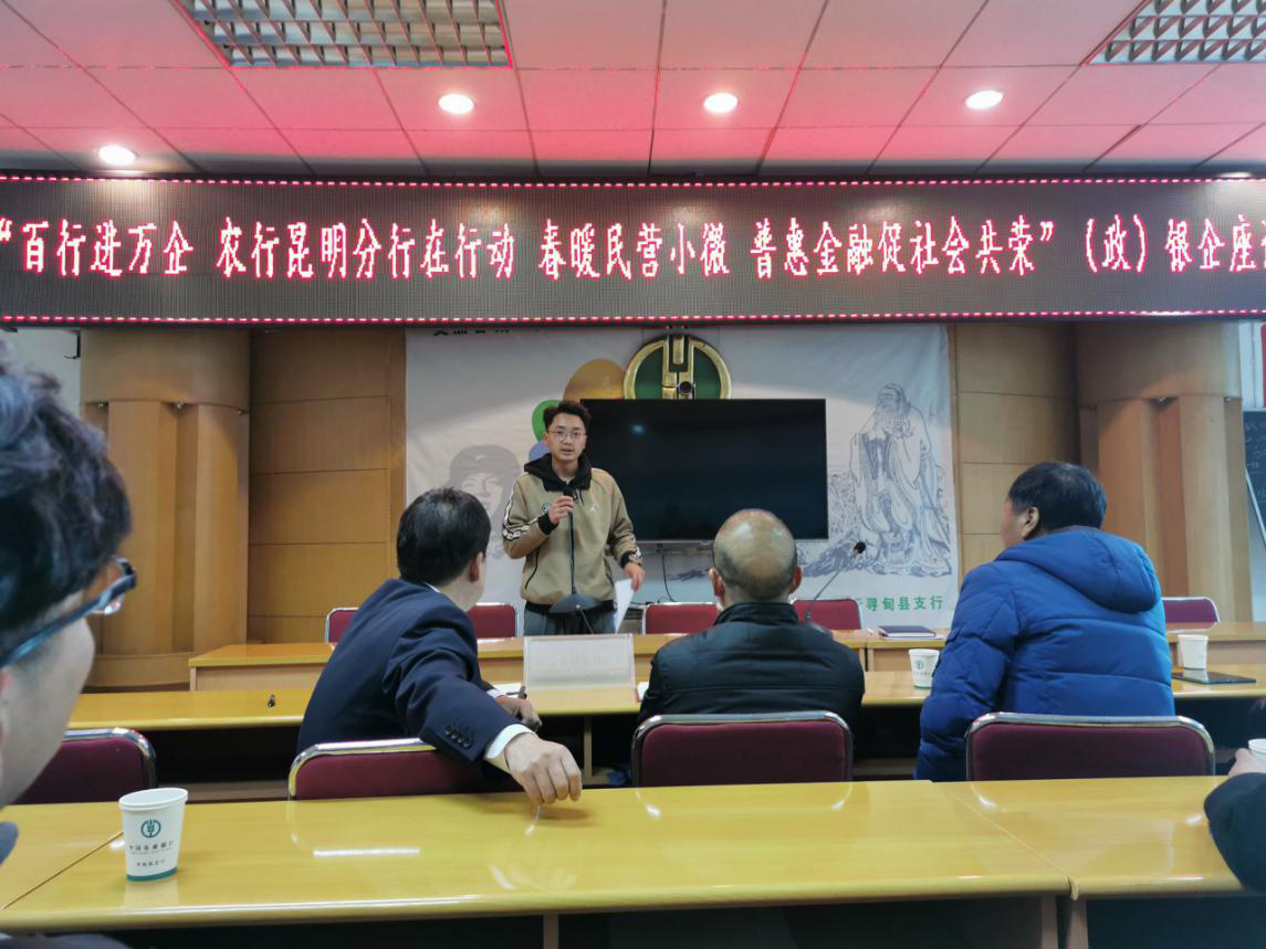 1月8日下午,受農業(yè)銀行尋甸縣支行邀請,尋甸辦事處韓雙營、段浩參加“百行進萬企,農行昆明分行在行動,春暖民營小微,普惠金融促社會共榮”(政)銀企座談會。人民銀行尋甸縣支行行長李凱、農業(yè)銀行尋甸縣支行行長馬繼軍、金所產業(yè)園區(qū)財政局局長秦菲及尋甸當?shù)匦∥⑵髽I(yè)代表參加本次座談。