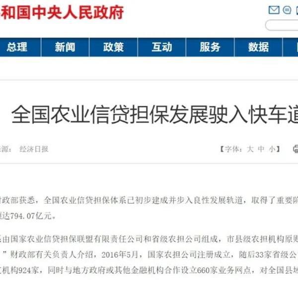 全國農(nóng)業(yè)信貸擔(dān)保體系已初步建成并步入良性發(fā)展軌道,取得了重要階段性成效。目前,全國農(nóng)擔(dān)體系資本金總額達(dá)794.07億元。